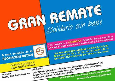 Varios clubes de servicios de la ciudad de Santa Rosa se unen en esta oportunidad con el fin de organizar un remate solidario a beneficio exclusivo del primer Centro CONIN en La Pampa, la Asociación NUTRIN, con sede en Santa Rosa.