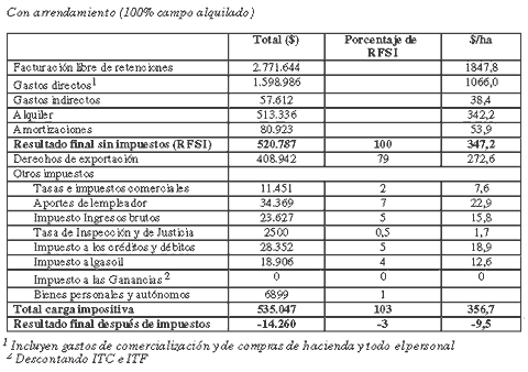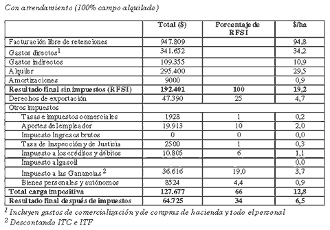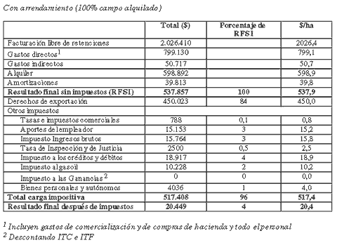 Al analizar este modelo con campo 100% arrendado, la explotación registra un Resultado Final sin Impuestos de 537,9 $/ha). Luego de las deducciones de los impuestos, el resultado del ejercicio asciende a 20,4 $/ha. El resultado final después de impuestos equivale al 4%, contra el 29% que arrojaba el resultado del mismo modelo sin arrendamiento.