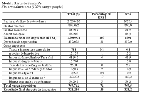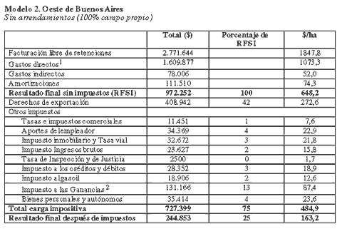Este modelo tiene un resultado final sin impuestos de 648,2 $/ha. La carga impositiva final representa el 75% del RFSI. De esta forma, el beneficio final asciende a 163,2 $/ha. Las retenciones son la principal carga tributaria: 42% del resultado anterior.