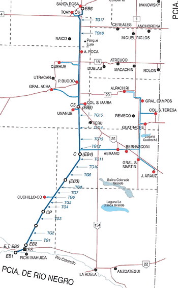 Este aspecto de la obra es de fundamental importancia dada su complejidad técnica. Esta conformado por 105 km de línea eléctrica de 132 Kv. entre Puelches y la planta de tratamiento, con la ampliación de la subestación transformadora de Puelches (obra ya terminada) y la construcción de la Estación Transformadora ubicada en la planta de tratamiento conformada por tres transformadores de 5 MVA cada uno de 132/13.2/6.6/0,38 Kv; 78 kms de líneas eléctricas de 33 Kv, 9 km. de líneas eléctricas de 13.2 Kv, con varias subestaciones de transformación intermedia, tableros, celdas y equipos de onda portadora. En construcción está una línea eléctrica de 13,2 Kv, para dar energía a cisterna principal, estación de bombeo Nº 3 y la localidad de Cuchillo Có.