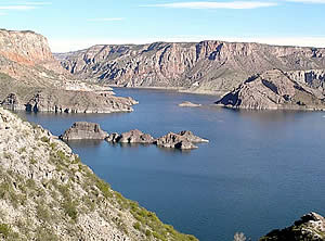 Subiendo desde la presa Valle Grande puede uno internarse en el Cañón del Río Atuel, testimonio fiel de los orígenes del mundo, moldeado por el viento y la lluvia que pugnan por esculpir sus formas erosivas en la roca, descubriendo figuras con semejanzas que ya son parte del folklore. Dentro de estas similitudes nos encontramos con El Sillón de Rivadavia, Los Monstruos, El Lagarto, Museo de Cera, El Mendigo, Los Viejos, La Ciudad Encantada, Los Jardines Colgantes y en el espejo de agua de uno de los lagos, surge imponente El Submarino (foto arriba), figura clásica de este paseo mendocino.