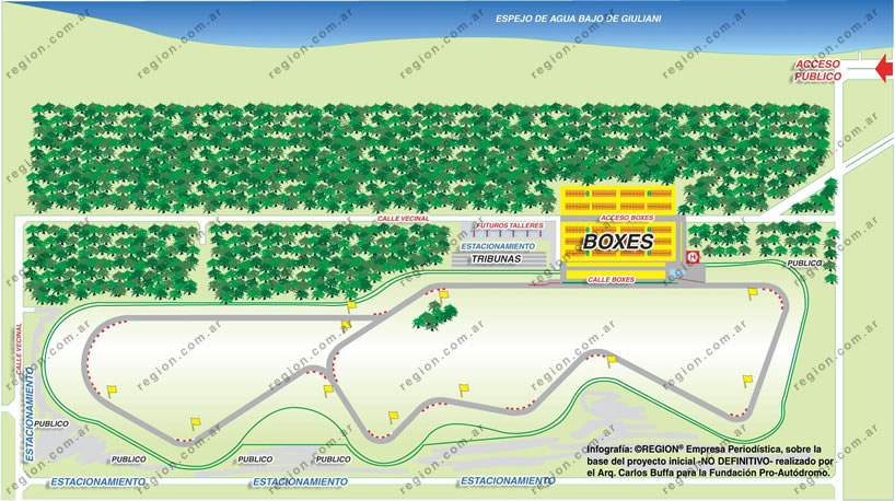 IMPORTANTE: Es necesario indicar con toda claridad, que el presente diseño de la pista del nuevo autódromo, no es el definitivo, sino el que en primer lugar se elaboró, ajustado a las normas de la ACTC, desarrollado por el Arq. Carlos Buffa. El diseño definitivo está sujeto a los resultados que arrojen los estudios técnicos que se están realizando y al mejor aprovechamiento de los recursos paisajísticos del lugar, estimándose para los meses de agosto o septiembre de 2006, la presentación del proyecto definitivo para lanzar ya la obra. |