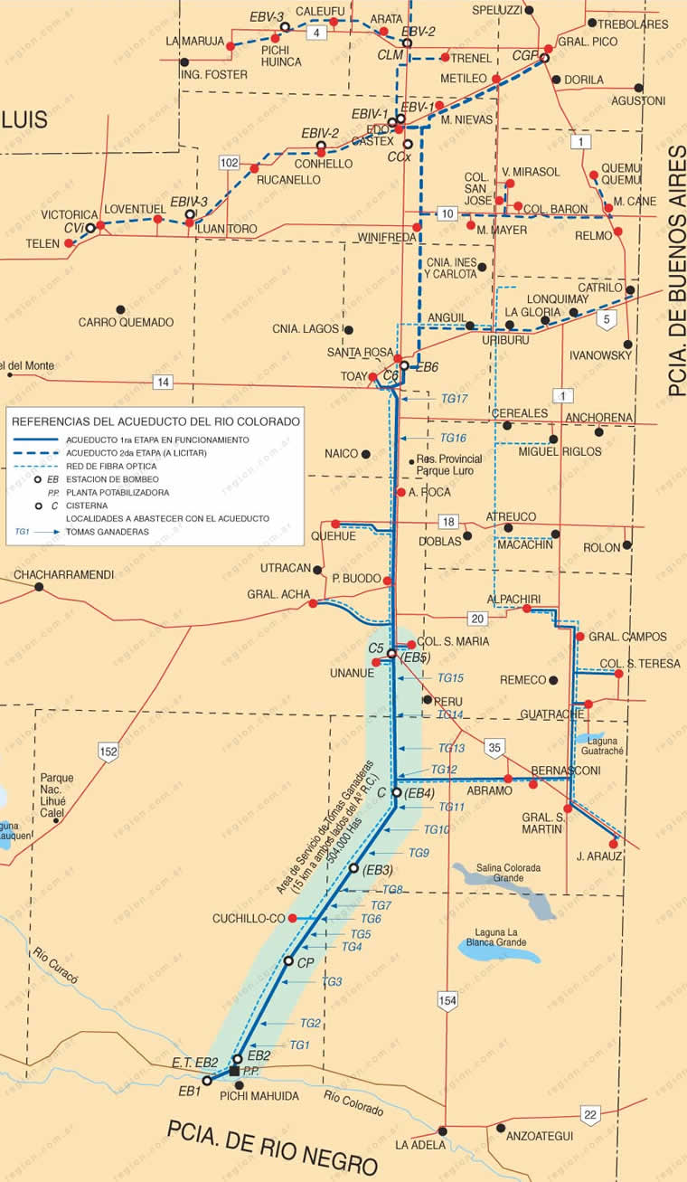La obra confirmada más significativa para La Pampa, por el volúmen de inversión y la importancia de la misma, es la construcción de la segunda etapa del Acueducto del Río Colorado (Santa Rosa - Edo. Castex - Gral Pico) y obras complementarias, con una inversión de 155 millones de pesos. |