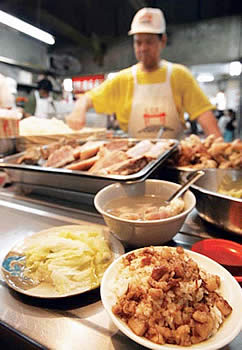 5. Arroz con carne en salsa: Este humilde platillo es en realidad el más único y esencial para la vida diaria. Algunas personas lo llaman «el plato nacional» por excelencia, en tan alta estima como lo son los fideos con carne en el departamento de sopas y pastas. Por 50 centavos de dólar estadounidense, usted recibe un pequeño plato de arroz fresco aromático y calientito, bañado en una salsa de carne de cerdo cocinada en su grasa y adobada con salsa de soya. Esta carne se deja cocinando con especias por varias horas, hasta que se deshace naturalmente. Se corta en cuadritos y se sirve sobre arroz fresco. Simple, pequeño, delicioso.