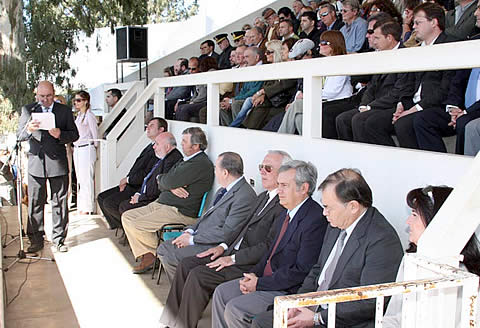 El presidente de la AAGLP, Andrés Souto, en el mensaje de apertura junto a toda la dirigencia oficial. Gran cantidad de carteles con reclamos del sector, rodearon toda la pista central de la expo. |