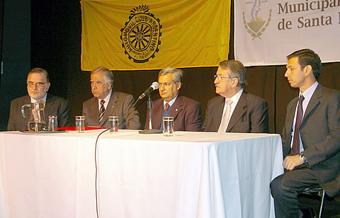 Mesa de la apertura del Programa, integrada por el secretario municipal de Gobierno y Acción Social, Pedro Salas; el presidente del ACA Filial Santa Rosa, Rodolfo Marinelli; el intendente de Santa Rosa, Francisco Torroba; el jefe del Departamento de Asuntos Viales y Cartografía del Automóvil Club Argentino, Julio Bovio y el subsecretario de Turismo de la Provincia, Santiago Amsé. |